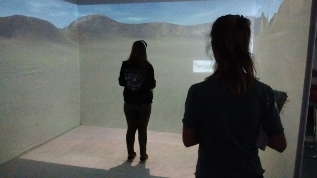 La tarea era la siguiente: la/el participante se centraba en medio del escenario, la Cave, y se proyectaba un escenario agreste que simulaba una cantera abandonada con leves referencias espaciales específicas: montañas con distintos matices y nubes. “Nos dimos cuenta que lo mejor era utilizar un paisaje lo más homogéneo posible, con pocas claves espaciales y sin distracción como sonidos del ambiente”.