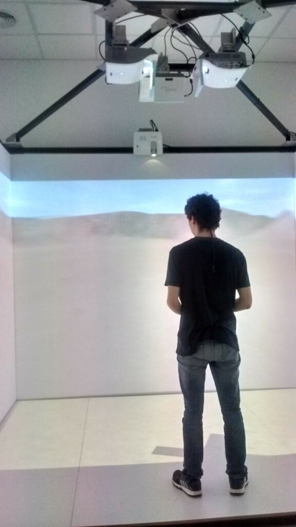 Para llevar adelante el desarrollo del software y el posterior estudio en personas se utilizó la Cave, un simulador de realidad virtual inmersiva que se encuentra en MediaLab. Se trata de una sala donde se proyectan imágenes generadas por computadora en paredes y pisos, permitiendo una visión de 180º, con la posibilidad de recrear distintos tipos de escenarios.