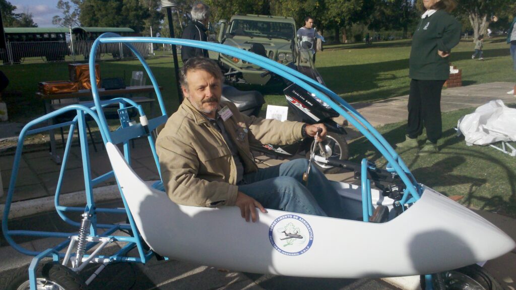 Junto a un equipo del GEMA se puso a trabajar en un prototipo de triciclo con partes de helicóptero, la nariz de un planeador y pilas. Pilas de litio. Lo bautizaron “Protolitio” y en diciembre de 2012 se lanzó a la Ruta 2 para realizar una travesía de 400 kilómetros (de La Plata a Mar del Plata) a 35 kilómetros por hora con una sola carga de batería. Después de eso no paró.