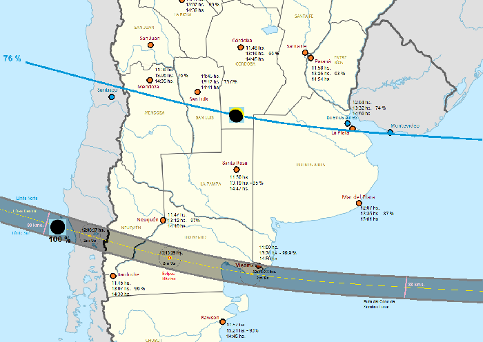 Por ejemplo, en La Plata, donde se generará un eclipse parcial, “se ocultará hasta un 75% de la superficie del Sol. Comenzará a las 12:05 del mediodía y tendrá la máxima superficie cubierta a las 13:35 y el disco solar quedará descubierto a las 15hs”, explicó Corti.
