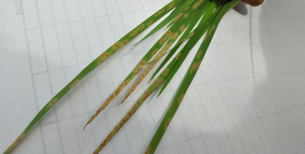 A simple vista, la roya origina puntos naranjas en las hojas que se denominan pústulas. “Eso necrosa la hoya y reduce el área foliar fotosintética. La planta va a hacer menos fotosíntesis en base a eso. Se va a reducir la biomasa y consecuentemente el rendimiento”, explicó María Rosa Simón, profesora titular de la Cátedra de Cerealicultura (FCAyF-UNLP) e investigadora a cargo del proyecto.